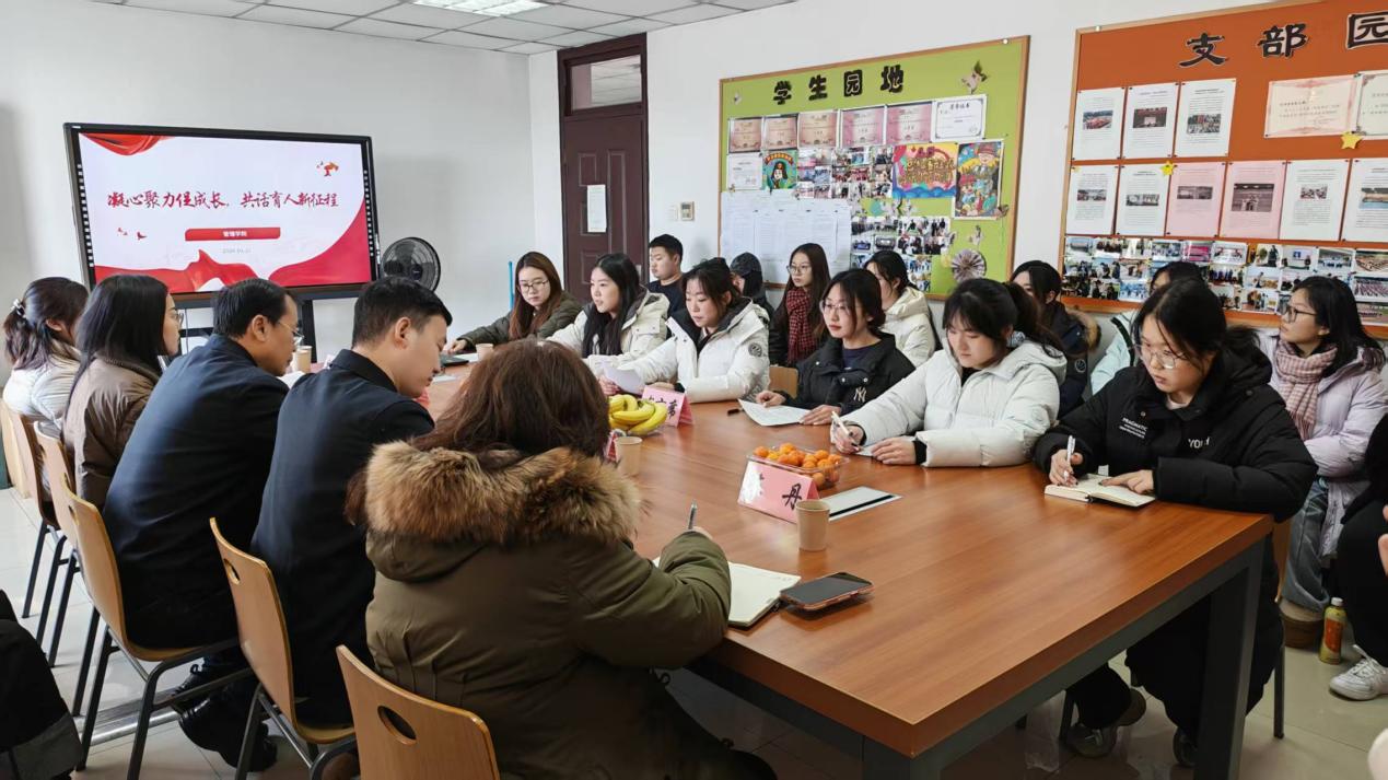 随后,学生干部温垚、张邑彤、胡子玉、李金梦依次发言,分别从党建引领、党员发展、学生干部自身成长和收获等方面,分享了各自在实践中的成长历程和宝贵感悟,言语间满是责任与担当,充分展现了管理学院学生干部的优秀素养。